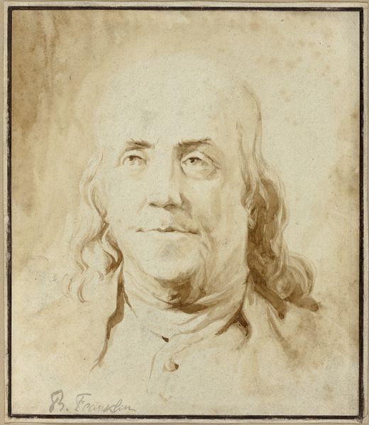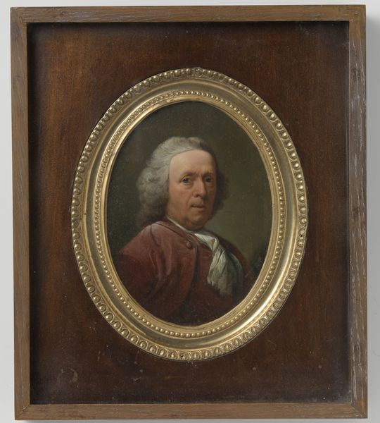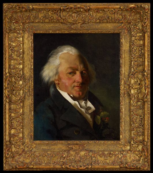 Editor: Here we have Joseph Duplessis’s *Benjamin Franklin*, created in 1794. It's an oil painting, and right away I’m struck by how…domestic he looks. Almost like he’s about to offer you tea! What do you see in this piece? Curator: Well, put down the crumpets, because while he does look rather genial here, doesn't he? I see a layering of identities, of course. This isn't just 'Ben at Home'; it's Franklin the statesman, deliberately framed within the visual language of French Neoclassicism. Editor: Neoclassicism? I wouldn’t have guessed that. Curator: Look at the emphasis on clarity, balance. The simple, almost severe, composition. It speaks of Enlightenment ideals: reason, order. But Duplessis was clever. He infused it with a warmth that counters the chill of pure intellectualism. A kind of "everyman intellectual" perhaps? I’m curious about the framing of the painting itself… Doesn't the ornamental, decorative border contrast sharply with the austerity of the portrait? Editor: Oh, you're right! It's…excessive compared to his simple coat and demeanor. Almost like two different worlds colliding. Curator: Precisely! And that, my friend, is the magic of art. These supposed contradictions reveal so much about the sitter and, crucially, the artist's vision. The frame, if I may propose, whispers of the aristocratic patronage while the portrait firmly focuses on republican virtue! How do you see this contrast working? Editor: It’s fascinating to consider these layers of meaning. I came in thinking “cozy,” and now I'm seeing this intense negotiation of identity and class! I guess you really can't judge a painting by its frame, eh? Curator: Precisely, to always keep questioning!