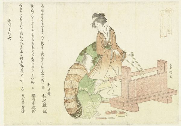 Ike no Taiga created "Daito keigo (3)" with bold outlines and flattened space, presenting a wrestling scene with minimal detail. The composition is divided by the fold of the paper, drawing attention to the formal elements. Taiga's simplification reduces the figures to essential forms, emphasizing line and shape over realism. Note how he used line to define the contours of the figures. The interplay between positive and negative space creates tension, with the wrestlers' bodies intertwined in a dynamic yet balanced arrangement. This abstraction challenges traditional representation, focusing instead on the structural components of the image. The limited palette further underscores the emphasis on form, as Taiga invites us to consider how reduction can amplify meaning. The print operates within a semiotic system where the wrestlers' gestures are signs that point to broader cultural narratives of strength. "Daito keigo (3)" encourages ongoing interpretation.