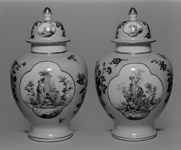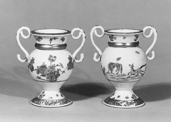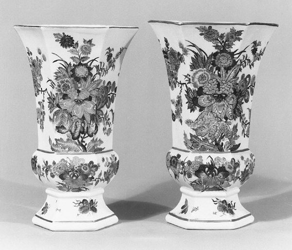 Editor: Here we have a pair of vases crafted by the Capodimonte Porcelain Manufactory, sometime between 1745 and 1750. The intricate floral details really grab my attention. What can you tell us about these pieces? Curator: These vases are fascinating examples of Rococo porcelain. The Capodimonte Manufactory, under Charles VII, was heavily influenced by Meissen and other European porcelain centers, but it developed its own distinct character. Notice how the floral motifs aren’t just decorative; they're signs of the court’s attempt to emulate royal porcelain from other regions. How do you think porcelain was regarded at the time? Editor: As incredibly precious, I imagine! Sort of like owning a piece of royalty itself. Were these vases meant to hold actual flowers, or was it more symbolic? Curator: Probably both, although their delicate nature suggests primarily a display function. The porcelain boom occurred because it provided an opportunity for families of wealth and nobility to flaunt social standing, thus, the vase as object. We can't underestimate porcelain's role in defining social and economic status in the 18th century, specifically for aristocrats wishing to communicate prestige in the domestic sphere. Editor: It’s like a status symbol disguised as a vase. Did the delicate nature of porcelain somehow contribute to that air of aristocratic fragility and exclusivity? Curator: Absolutely. The material itself spoke of refinement, wealth, and even a kind of power, as it was so closely associated with the ruling classes. And, the placement of the vases -- within private residences, primarily for viewing and social commentary - shaped and maintained that perception. Editor: I had not considered porcelain’s role in consolidating class. Curator: Precisely. They reveal the intertwined dynamics of art, power, and society during that period, not simply about visual appeal, but also about meaning. Editor: I never would have thought about these beautiful flower vases having so much social weight. It makes you wonder about the statement being made.