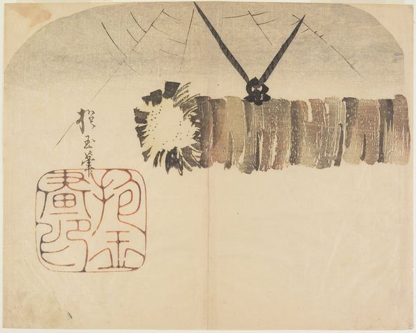 Editor: Here we have "Cover From a Japanese Illustrated Book" dating back to between 1729 and 1749, currently housed in the Metropolitan Museum of Art. It's a woodblock print by Okumura Masanobu, and it strikes me as both delicate and bold, a curious blend. What draws your eye most about this piece? Curator: It’s got this fascinating quietness about it, doesn’t it? The whisper of a landscape alongside the bold declaration of text. I'm drawn to how the landscape with what appears to be Mount Fuji lurking in the background sort of melts into abstract shapes, barely there. There’s almost a sense of… remembering, not actually seeing. A ghost of a place. Do you get that feeling? Editor: I do. The almost faded look gives it this dreamlike quality. And what about the kimono shape and text on the right side? Does it connect to the landscape at all, or is it doing something completely different? Curator: Oh, definitely connected, but subtly! That's a clever question. Ukiyo-e prints, like this one, often play with connecting everyday objects like the kimono to deeper cultural or historical narratives. Perhaps the kimono belonged to a figure associated with the landscape, or the scene from the text alludes to similar ideas present on the landscape’s side. You see that tension and harmony? I think there is something beautiful and maybe a little melancholy about that. Editor: That's amazing, I hadn't even considered the two halves interacting like that. It almost feels like two different stories blending together on one page. Curator: Precisely! That kind of layering is what makes art from this period so enriching. Each glance reveals a new possible narrative or interpretation. Maybe you, yourself, should try and dream a story from it. Editor: I will. I think that blending is now my favorite part! It adds so much depth and it makes me want to explore more works from the period to see if that "two-stories" approach shows up elsewhere.