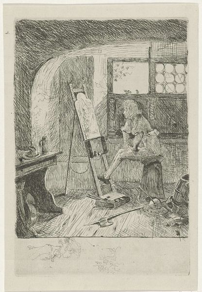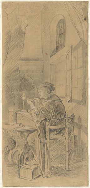 Jean-Louis Forain rendered "Print Connoisseur" with charcoal and watercolor, using muted earth tones that create an intimate and contemplative mood. The composition is dominated by the figure of a man kneeling before an easel, his form hunched in attentive study. Forain’s handling of line and shadow is particularly striking. Observe how the loose, gestural lines create a sense of immediacy, while the selective use of wash emphasizes the play of light on the prints, drawing our eyes to what captivates the connoisseur. This contrast between the lit artwork and the shadowy interior raises questions about the nature of artistic appreciation and the subjective experience of viewing. The act of connoisseurship is presented here not merely as an intellectual exercise, but as a deeply personal engagement. Consider how the formal elements—the somber palette, the careful balance of light and dark, the dynamic lines—converge to communicate a sense of quiet intensity and introspective focus. These elements encourage us to reflect on what it means to truly see and understand art.