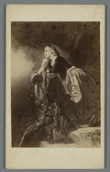 This is Julia Margaret Cameron’s photograph, "Gareth and Lynette". Its sepia tones and soft focus present a scene of dreamy introspection. Cameron often used her friends and family as models to enact literary and historical themes. The composition features two figures arranged in a tableau vivant. Gareth lies in repose, while Lynette gazes down at him, an almost Pre-Raphaelite idealization. The figures are framed by foliage, creating a constructed, theatrical space rather than a candid snapshot. The soft focus, a characteristic of Cameron’s work, isn’t a technical flaw, but a deliberate aesthetic choice. It elevates the scene beyond mere representation toward something more symbolic. What is visible is not sharply defined, but veiled, alluding to the layers of meaning beneath the surface. This challenges the traditional photographic values, and opens up a space where photography meets poetry. It is a dialogue between the real and the ideal.
