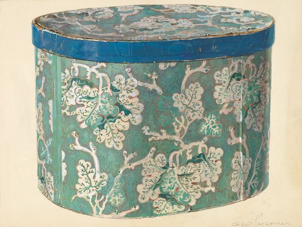 Gilbert Sackerman created this watercolor painting of a bandbox, distinguished by its curving, oval form. The overall structure presents a play of geometric versus organic elements. The bandbox is rendered with careful attention to its surface design, floral patterns set within curvilinear frames. These decorative motifs suggest a semiotic system of coded meanings around domesticity. The delicate watercolor medium enhances the object's textural qualities, lending it a tactile presence. Sackerman's composition, with its emphasis on pattern and form, invites us to consider how everyday objects can be transformed through artistic representation. This approach challenges fixed categories and offers new ways of thinking about the intersection of art, life, and representation. In its design, the bandbox operates within a cultural discourse of aesthetics and functionality. The function of the watercolor lies in its ability to capture and reimagine these values.