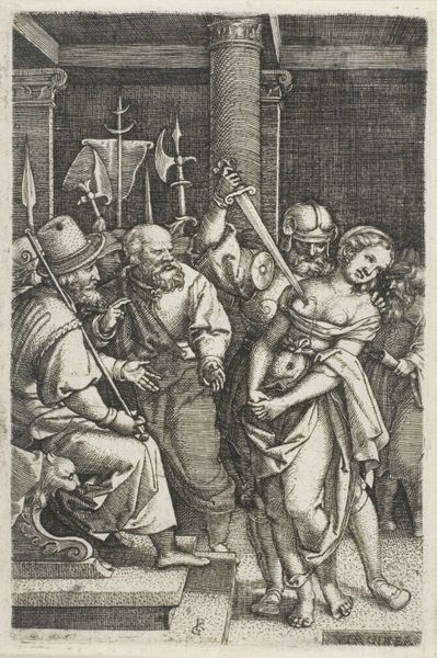 Editor: So, we're looking at Georg Pencz's engraving from 1544, "Joseph explains his dream to his brothers and father in an interior setting; the sun, moon, and stars above a landscape in the portal beyond." It's incredible the level of detail he achieves with just lines! I am struck by how the biblical story is set in what seems to be a very contemporary, Northern European setting. What stands out to you in this piece? Curator: I'm particularly interested in how Pencz, operating within the Northern Renaissance tradition, utilized the material process of engraving to both disseminate biblical narratives and reflect contemporary social structures. Notice how the labor-intensive nature of engraving – the meticulous carving into the metal plate – mirrors the themes of craftsmanship and production that were central to 16th-century Northern European society. Editor: That's interesting, I hadn’t considered that! Could you elaborate more on the context? Curator: Consider the implications of printmaking as a means of production. It allows for the multiplication of images, and therefore, the broader circulation of ideas. This piece speaks to the accessibility of religious narratives to a wider audience, facilitated by new technologies and distribution networks. Also, reflect upon how this access impacted society. Did it challenge or reinforce existing hierarchies? Editor: So it's not just about the image itself, but about how the means of making it influenced society at the time? The printing press and engraving making narratives far more accessible? Curator: Exactly! The piece itself also reflects class divisions; what type of patrons do you suppose supported an engraver such as Pencz? And where might these images have been displayed or stored? These elements provide important insights into cultural and social stratification of the time. Editor: Thinking about the art's journey – from Pencz's workshop to its various owners and now a museum – really highlights its life as a material object, shaped by production, consumption and trade. Curator: Indeed! It pushes us to reconsider traditional art historical narratives by recognizing that it is not solely aesthetics which matter, but a much more multifaceted picture which must consider historical and social elements.