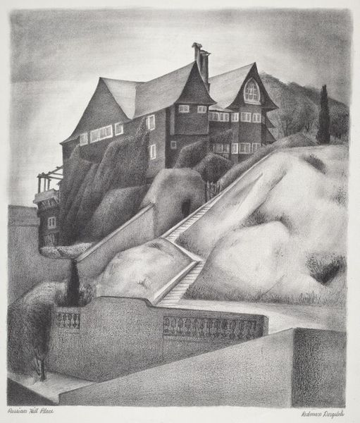 Editor: This is Julian Trevelyan's "My Garden," a print from the Tate collection. The geometric shapes and almost whimsical details make me think of childhood drawings. What do you see in this piece? Curator: Trevelyan's work often layers personal narrative with the social landscape. Consider post-war Britain; these tightly packed homes speak to a need for community, while the garden hints at a longing for a return to nature after industrialization. How does that reading resonate? Editor: That's a powerful interpretation. Seeing it as a response to social needs and desires makes it much more than just a simple landscape. Thanks! Curator: Indeed. Trevelyan gives us a view into the intersection of the personal and the political, reflected in something as seemingly simple as a garden.