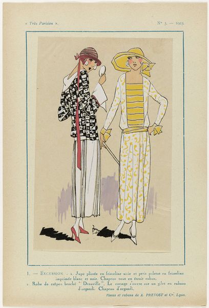 G-P. Joumard created this pochoir print titled "Très Parisien, 1923, No 1: Tissus de RODIER..." At first glance, you're met with the striking contrast of black velvet coats against the softness of fur and bright accents. The composition is dominated by the vertical lines of the garments, yet softened by the organic shapes of the fur trim and the floral patterns, giving a certain visual rhythm. The print plays with semiotic codes of fashion and femininity, set against the backdrop of post-war Parisian society. These elements create a narrative about modernity and elegance. The color scheme is intentional: the blacks and whites offset by the flashes of pink and gold serve to highlight the fabrics themselves. Joumard's work uses this visual interplay not only to showcase the fashion of the time, but to subtly question ideas of artifice and beauty. It prompts us to consider how fashion, like art, is a constructed system of signs.