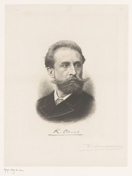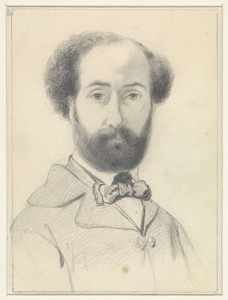 Curator: Immediately, the subdued palette strikes me, a near monochrome punctuated only by skin tones. The brushwork, though controlled, suggests an underlying dynamism. Editor: This is Ivan Kramskoy’s 1871 "Portrait of the Artist Mikhail Konstantinovich Klodt." Klodt appears every bit the archetype of a serious, 19th-century artist. Curator: Observe how Kramskoy employs a limited range of earth tones to create depth. The textures in the beard and the folds of the coat are subtly rendered, drawing the eye to the face and the peculiar object in his hand. Is that a T-square? Editor: Indeed it is. Klodt holds a T-square, a tool signifying his profession as a painter, and his posture projects an image of focused determination. It implies not just craft, but intellectual rigor applied to the observation of nature. Curator: Yes, but there's something more here than just a professional emblem. The way he delicately holds it, almost reverentially, suggests it is symbolic of more than the sum of its materiality and utilitarian purpose. Perhaps alluding to precision, order, even, dare I say, a kind of artistic 'truth'. Editor: He’s not only an artist but a cartographer of culture through paint, isn’t he? Look closely; the details speak of a certain social standing. It could also relate to Russia's broader cultural identity at this period. Remember Klodt's family lineage, with his uncle being the famous sculptor Peter Klodt von Jürgensburg. It places him firmly within a cultural elite. Curator: Interesting that Kramskoy, who championed Realism, veered away from idealized forms, which does not imply that this painting does not make Klodt noble. Instead, he uses Klodt’s figure to make painting itself noble. And in this way Kramskoy shows what that can mean, formally. Editor: Absolutely, the artist immortalizing the tools and signifiers of his craft while making visible his inner drive is such a profound connection. The subdued tones speak subtly of a seriousness of intention and suggest an era steeped in self-examination through portraiture. Curator: Kramskoy offers a glimpse into Klodt’s interiority through the objective representation of exterior details; as much as he renders it accurately, though, the artist also turns reality into a set of self-aware, painterly strategies. Editor: And that intersection makes it an ever more relevant work of visual and cultural exploration.