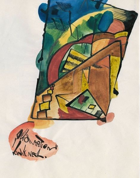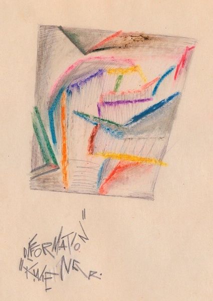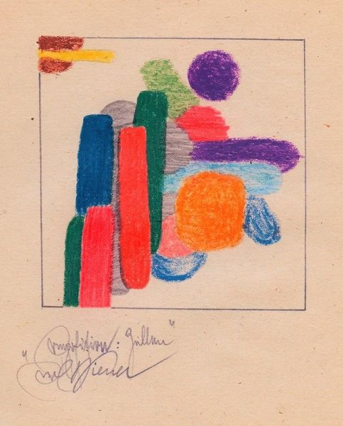 Curator: Karl Wiener's "Bunter Aufbau," circa 1923, presents an intriguing example of German Expressionism. Executed with colored pencils, the piece immediately strikes one as a deliberate exploration of form and chromatic interaction. What's your initial take? Editor: Well, right off the bat, it feels like a kid’s fever dream of building blocks, doesn’t it? This off-kilter tower just wobbling there... I can almost feel that scratchy colored pencil texture from when I was a kid! Curator: Precisely. The texture contributes significantly to the overall aesthetic. Observe how the geometric shapes, rendered in varying hues, interlock. This composition, while appearing haphazard, reveals an underlying structural logic that is consonant with the period’s artistic exploration of space and perception. Editor: Logic, huh? I see the shapes, I see the colors... orange bumping up against a kind of sullen blue... but logic? Maybe it's the 'logic' of emotion, like trying to stack up how you *feel* inside. It’s wonky, unbalanced. I get a nervous energy from it, like something’s about to topple. Curator: Interesting interpretation. It highlights the inherent tension within Expressionism. While seeking objective representation, there's a palpable undercurrent of subjectivity, a grappling with internal states projected onto external forms. The color palette itself acts as a signifier, the clashing tones evoking a sense of unease. Editor: Right, those clashing tones! Like a clown threw up on an architect’s model. But, in a compelling way. It's playful but almost aggressively so. Curator: Perhaps Wiener intended to destabilize conventional perspectives. He uses abstraction, rather than replication, to access more elemental aspects of visual expression. It serves as a critique, perhaps, of the rigid societal constructs. Editor: Hmm, maybe you’re onto something. It does feel like it's pushing against boundaries, visually, emotionally... It's a rebel yell in colored pencil. Curator: Indeed, "Bunter Aufbau" embodies the complex dialogue between form and emotion that defines Expressionism. Editor: Absolutely! I see it now... this quirky little drawing has more to it than I initially thought!