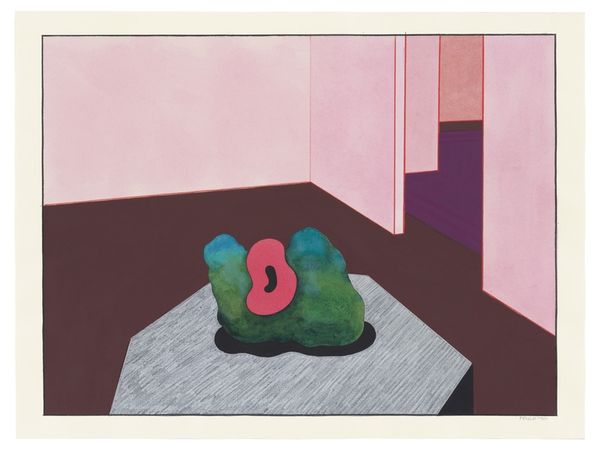 Curator: Here we have Tom Wesselmann's "Study for Drop Out Nude," an acrylic painting from 1981. What's your initial read on this piece? Editor: It’s striking. There’s a dreamlike quality; that oversaturated color palette evokes both desire and alienation. Curator: Precisely. The painting fragments the female figure—a signature move for Wesselmann, especially in his exploration of nudes within domestic interiors. Look at the clean lines and blocked colours. The lack of shadow creates flatness. Editor: Yet the pink stocking reads erotically while disrupting the composition. It pushes back against art-historical framings of the passive nude by drawing attention to its commodification within the visual culture of Pop Art. Curator: Absolutely. He isolates parts of the female body, transforming them into emblems of a mediated consumerism. The composition almost mimics collage—elements are clearly defined. See the painting within a painting? Editor: Right—Wesselmann frames an ideal woman in two instances. Is he emphasizing the doubled objectification—the subject mediated, then framed for viewers as an inert fantasy? The lamp also evokes a false domestic comfort, contributing to a very cold depiction of intimacy. Curator: That's a sharp insight. This “Drop Out Nude” plays with surface and depth, artifice and reality. It invites viewers to reflect on how we perceive, consume, and ultimately idealize representations of the body. The canvas almost reads like an advertisement. Editor: Yes, that cold artificiality mirrors advertisement, while simultaneously highlighting a cultural context shaped by misogyny in ways that feel very telling, even now. There's an uncomfortable intimacy here that transcends just "art for art's sake." Curator: An articulation of late capitalist anxiety manifested through form and technique; I'll agree. The power of those flattened shapes, and limited colour register, amplifies meaning here. Editor: Absolutely. Wesselmann challenges, or at least reflects on, the gaze, compelling us to consider its societal implications. Curator: I concur; food for thought!