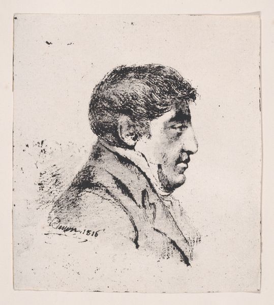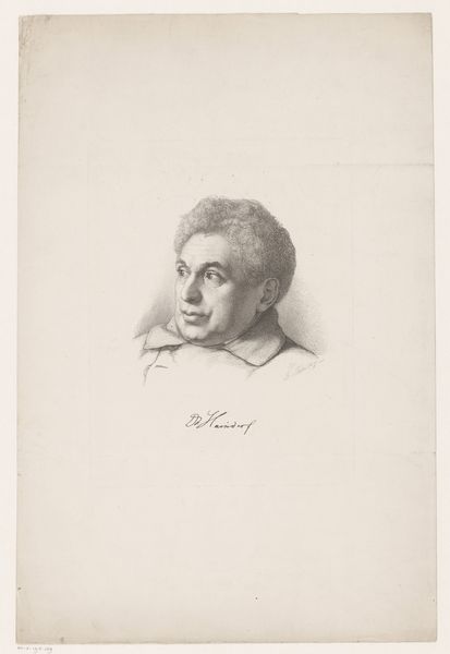 Curator: Oh, this portrait of Bagermester Købke. Look at the determined set of his jaw. His gaze, even in profile, feels remarkably direct. Editor: It feels austere. Striking, of course, with the dramatic contrasts of light and shadow created by the graphite and charcoal, but also... quite working class. You can feel the material pressure behind it. Curator: Working class? It's a fragment, mind you, a section of a sheet containing three portraits, all rendered between 1832 and 1835. Købke did this of his father; it humanizes him and suggests so much beyond what's depicted. It invites you to ponder the full man behind the face, perhaps the struggles of his bakery. Editor: Exactly! That’s what I’m saying, that’s the feeling it conveys to me – hard labor. And done with graphite, charcoal – materials of industry! This isn’t some grand oil painting commissioned by royalty. Look closely: every stroke signifies a kind of... well, it feels honest, doesn't it? No pretense here, just pure utility of media meeting subject. A bakery owner rendered with the tools of, metaphorically, soot and labor! Curator: There's also a certain vulnerability. It’s a tender gaze from son to father, rendered in a softer manner, despite its realism. Do you notice the light catching the furrow in his brow? It gives me this palpable sense of fleeting moments, an embrace. The details in the wisps of his unruly hair—romantic, even. Editor: But the lithographic print! It inherently makes it more accessible, ready to be disseminated... a democratic multiple! Think about that reach! That choice of medium is a deliberate, quietly subversive act in itself. High art applied to, and accessible to, a much broader public, beyond those velvet-rope boundaries. Curator: I see that. I do think we come back to KØbke's intimate and personal artistic vision though, capturing something fundamentally human in his father. Something timeless. Editor: True. Though even intimacy is made available and ready for dissemination through the materiality of it. It really makes me think of all the bakers of the world now, all of their products moving within the currents of capitalism and consumption. That starts here, within the artwork itself, its choices, material presence, even its social implications.