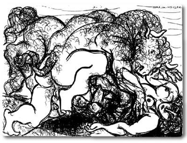This is Pablo Picasso's "Crucifixion (study)," and it's all about lines, like a wire sculpture flattened onto paper. The marks feel urgent, searching—Picasso's hand trying to wrangle something profound. It’s a drawing, right? So, you’re dealing with the bare bones of form, the architecture without the decoration. Look at the horse and rider on the right, like a jagged jumble, the line is thick, like he’s really digging into the paper. The ladder on the left is so simple and clear. Then you see a series of crosses that appear to float above the figures, like a strange, minimalist crown. Picasso does what Philip Guston does later: he lets the subject matter rise to the surface. He embraces all the ambiguity in life, the beauty, the horror, the comedy.