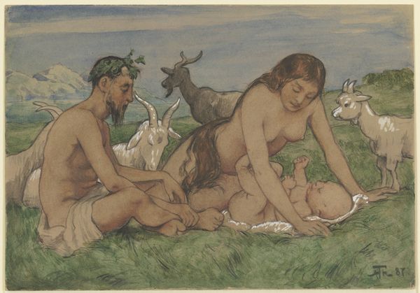 Editor: This is "Faun and Nymph" by Hans Thoma, a watercolor drawing from 1888 currently housed in the Städel Museum. It’s such a curious piece. The style feels classical, but there's a distinct softness in the watercolor that makes it seem more modern. What is your read on it? Curator: I'm interested in how the medium—watercolor on paper—itself contributes to the artwork’s meaning. The way Thoma uses watercolor speaks volumes about access to art making in the late 19th century. This wasn't necessarily a commission for the elite, but rather could've been made for the emerging middle class. This changes the dialogue entirely when comparing it with art created for aristocracy. Editor: I never thought about the economic aspect that intimately! Curator: Absolutely! Consider the labor involved, the availability of the paper, pigments, and even artistic training at the time. Watercolor was more accessible, more easily transported and stored. Did the democratization of artistic materials change the type of subject matters to be more domesticated as opposed to glorious mythological settings? Editor: So, the choice of watercolor, being more accessible, made it easier to create works like this one, opening doors for a broader range of artists and even impacting the chosen themes? Curator: Precisely! It shifts our focus from solely aesthetic value to understanding the means of artistic production. Understanding these choices lets us appreciate what went into producing something as supposedly whimsical as nymphs or fauns. Editor: That gives me a lot to ponder about Thoma's work. Thank you for pointing out materiality and context, making me rethink how materials and social environment come into play. Curator: The materials themselves tell a rich story that has yet to be fully decoded. Art and labor.