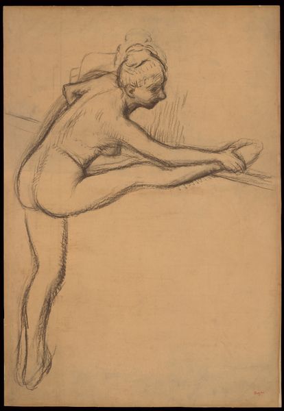 Caspar Netscher, a Dutch Golden Age painter, created this study of legs with chalk on blue paper. Netscher, who spent time in both the Hague and France, lived in a society marked by increasing wealth among the merchant classes, colonial expansion, and the ever-present legacy of religious conflicts. As portraiture gained popularity, detailed studies of the human form became essential for artists. But, what does it mean to isolate and examine a body part? This study, a fragment, is less about the individual, and more about the universal, about the classical ideal. By focusing solely on the legs, Netscher invites us to consider the body not just as a whole, but as a collection of parts, each with its own form and function. It’s a study in shape and light, but it also reflects the period's increasing interest in the human body. What do you feel when you look at this drawing? Do you see beauty, precision, or something else entirely? Netscher's study prompts us to reflect on our own perceptions of the body and its representation.