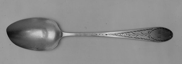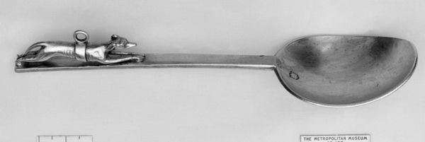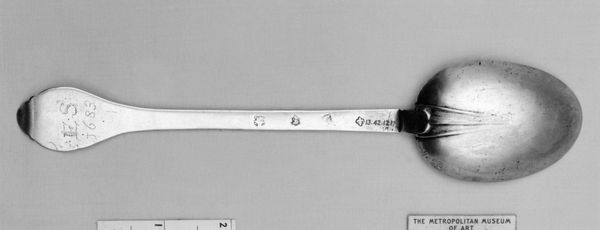 This silver spoon was made by William Scarlett sometime in the late 17th century, it lies flat on the surface, exhibiting a muted gleam. The spoon's form, with its elongated handle and bulbous head, presents a study in contrast and balance. Note the juxtaposition of the plain, almost severe lines of the handle against the ornate, swirling engravings adorning the spoon's head. These engravings, a dense network of curvilinear patterns, create a visual texture that plays with light and shadow, evoking a sense of opulent detail. Consider how Scarlett used symmetry and asymmetry to engage the eye; the handle's stark simplicity is a foil to the head's elaborate design. This approach challenges fixed notions of utility, transforming it into a decorative object.