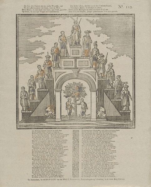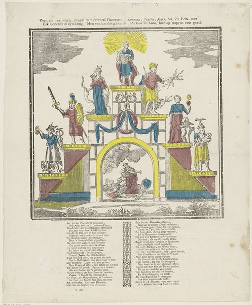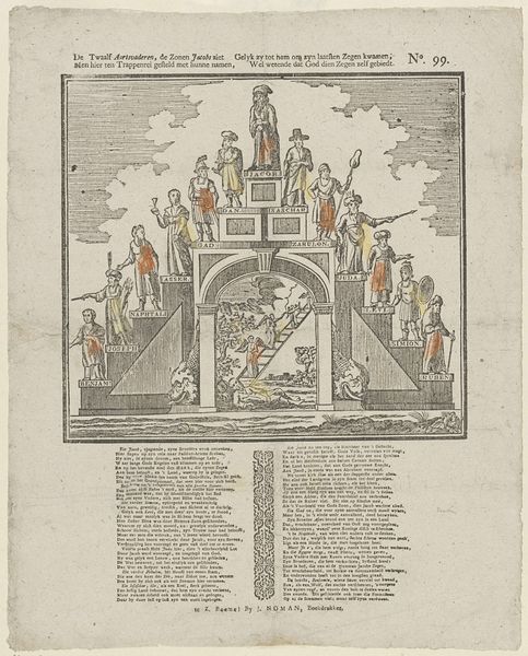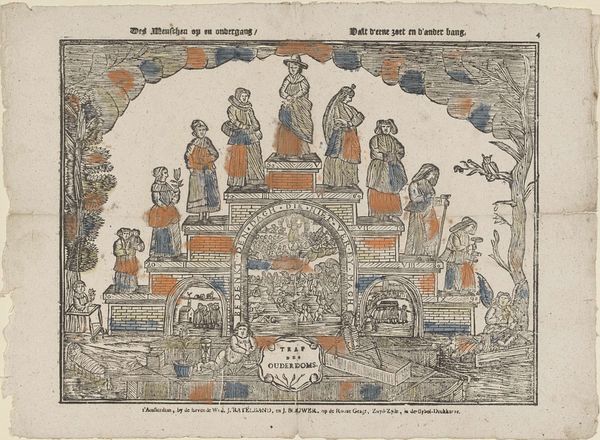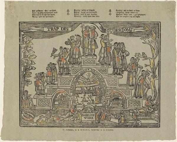 This allegorical print, "De trap des ouderdoms", was created by P.J. Masier with etching and possibly some hand-coloring. Immediately striking is its tiered, theatrical composition, framed by drapery to suggest a stage. The figures ascend these platforms, each level signifying a stage of life, rendered in somber greens and reds that evoke both growth and mortality. The composition's structure is quite telling; the arrangement of figures on each platform resembles a tableau, a static scene frozen in time. The use of symmetry – note the mirrored poses and placements – underscores the themes of order and progression. But this order isn't just aesthetic; it represents a worldview, a moral structure where life is a journey with predetermined stages. Masier destabilizes fixed meanings by confronting us with the inexorable passage of time. The "trap" or staircase becomes a symbol of life's unavoidable path toward old age and death. This artwork thus participates in a larger discourse about temporality, representation, and our own cultural codes for interpreting life's stages. The formal elements aren't just decorative; they are integral to the philosophical underpinnings of the artwork.
