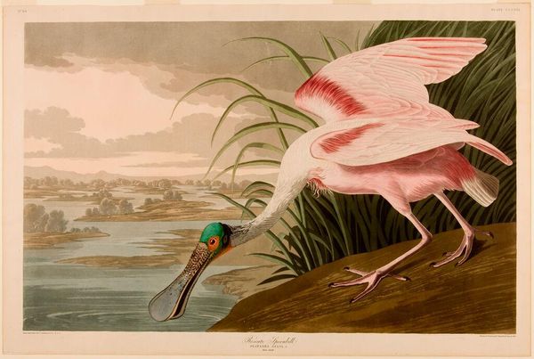 Editor: So, this is Alexander Wilson's "Birds 66. 1. Wood Ibis. 2. Scarlet I. 3. White Ibis. 4. Flamingo," made sometime between 1808 and 1814. It's a watercolor and engraving showing four different kinds of birds. I’m struck by how different the birds appear from one another – they seem almost allegorical. What do you make of the piece? Curator: Wilson's birds do have an iconic feel, don't they? Look at the poses, the deliberate placement within the landscape. Each bird represents a specific aspect of the American landscape Wilson was trying to capture, and, in turn, contribute to America’s self-image. The flamingo, for example, in its vibrant scarlet, isn't just a bird. It’s a symbol of exoticism, a tie to the Caribbean, to a wilder, more vibrant world that existed beyond the familiar. Editor: So, the colors aren’t just for realism, they’re symbolic? Curator: Exactly. Consider how color is connected to the psyche, and to cultural memory. Wilson emphasizes each bird’s distinctive characteristics. The Wood Ibis with its sombre palette speaks to solemnity. The painting doesn’t just present images of birds – it invites us to weave them into a story about a specific time, a place, and its ideals. How do you read the presence of a landscape in the backdrop? Editor: I hadn’t thought of it that way, but that makes sense. The landscape is not so much a habitat, but a blank canvas, emphasizing the symbolic presence of each of these birds. Curator: Precisely. The backdrop offers a stage upon which these iconic representations can play out. They can contribute meaning and shape the viewer's understanding of not only these creatures, but the land they occupy, the hopes for its future, and its developing identity. Editor: I see. So by putting them together like this, Wilson wasn't just showing different species, he was crafting a statement about the new nation's natural bounty and its place in the world. I’ll never look at these illustrations the same way.