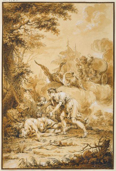 Editor: This is "Luna and Endymion" by Januarius Zick, created around 1778, using ink and gouache. I am immediately struck by how ethereal it feels, almost like a dreamscape captured in sepia tones. What's your take? Curator: I see a visual representation deeply rooted in its time, reflecting the cultural obsession with classical mythology that was so prevalent in the late 18th century. The Romantic movement, in particular, reveled in such allegorical scenes, especially those emphasizing dramatic emotion. Editor: What does the social context surrounding Januarius Zick tell us? Curator: Zick was a prolific painter in Southern Germany. He worked extensively for ecclesiastical clients but, this drawing is of secular nature, echoing trends set by the French Rococo artists. Think about how this idyllic scene plays out within the established art market: drawings after classical sources would be highly sought after by collectors seeking refined, ‘tasteful’ pieces. Are you familiar with the tale depicted? Editor: Vaguely. Something about the moon goddess falling in love with a mortal shepherd? Curator: Precisely. This tale, of a divine being and a mortal, resonated with aristocratic desires for courtly love, a refined and somewhat melancholy pursuit. And look at the cherubs overhead, reinforcing the theme of love. Editor: So, even in a seemingly simple drawing, we're seeing a reflection of societal values and power structures? Curator: Absolutely! It highlights how the very act of artistic creation and patronage reinforced specific ideals about beauty, love, and even social hierarchy. And these ink and wash drawings would later serve as models to create engravings. Editor: Fascinating! I initially saw just a pretty picture, but now I appreciate how much it reveals about the cultural and historical landscape of the time. Curator: It serves as a potent reminder of the politics of imagery. I appreciate your curiosity; seeing the art through your eyes reminds me of how multi-layered any single work of art can be.