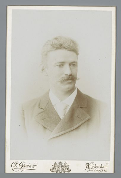 Editor: This photograph, "Portret van een man met snor," was taken by Albert Greiner sometime between 1882 and 1887. It’s currently held at the Rijksmuseum. The faded sepia tone gives it a real sense of history. What's your take on how this type of portrait fits into its era? Curator: It’s a window into the burgeoning middle class of the late 19th century and the increasing importance of public image. Photography at this time became more accessible, allowing individuals to participate in portraiture, once the domain of the wealthy. Think about it - how does this democratisation of image making affect social structures? Editor: That’s fascinating! So it's not just a portrait, but also evidence of changing social dynamics? Curator: Exactly. The sitter's attire—the suit and bow tie—and his carefully groomed mustache all speak to a desire for upward mobility and social acceptance. These photographic studios were powerful in shaping norms. Does that make you think differently about what’s being portrayed here? Editor: Definitely. It adds layers of meaning that I wouldn’t have considered at first glance. I initially saw a fairly straightforward portrait, but now I understand it reflects broader societal aspirations. Curator: And don’t forget the institution that holds the image, the Rijksmuseum itself is a statement, isn't it? How institutions like it collect, display, and frame this image of an anonymous, but likely aspirational, bourgeois man gives it further, modern, weight. Editor: I hadn't thought about the museum’s role in all of this, that’s a very interesting point. Now it feels like there are many aspects of the portrait that can reveal how images play a public role. Thanks for enlightening me!