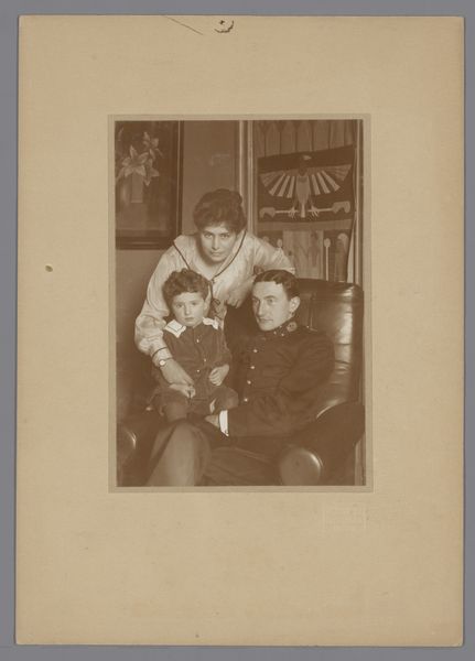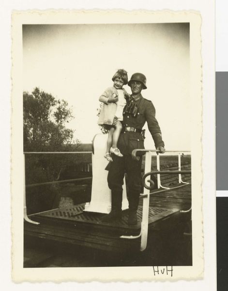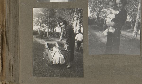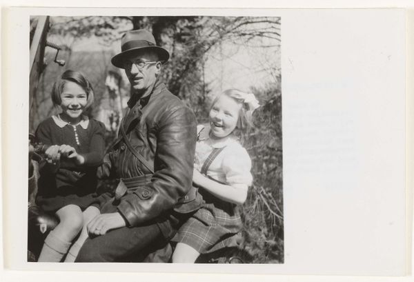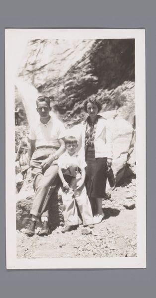 Editor: We're looking at Robert Frank's gelatin-silver print, "Peru, page 5" from 1948. It's a striking portrait, and I’m really drawn to the contrast between the textures of the clothing and the natural backdrop. What stands out to you about this work? Curator: I am drawn to the formal elements that structure this photograph. The use of light and shadow carves out planes in a way that adds considerable depth to this gelatin print, does it not? I think of semiotics; the hats that adorn the subjects establish a framework and communicate the context for the photograph as much as their faces do. Are you seeing something similar? Editor: Yes, I think that's insightful. The hats definitely ground the image and bring to the forefront a specific cultural moment. There is a softness to the clothing versus the sharpness of the shadows, the hats as a symbol juxtapose hard/soft notions here. I also noticed the picture looks like it comes out of a binder. Any thoughts why it includes the binder as a component? Curator: It adds a critical meta-layer. We must think, is this inclusion random or a very important gesture? What is this image attached to? I believe there is a conceptual framing element. Its material form gives added structure and invites considerations of how this work may connect to ideas about image, object, and meaning in Post-Impressionism. Editor: This discussion has highlighted a very new way of approaching the work. Thinking of the image as a visual marker, alongside the material and meaning, will shift how I analyze photographs from now on! Curator: Precisely. And focusing on formal elements will give you deeper access into more varied perspectives.