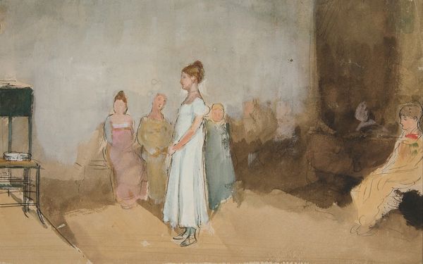 James McNeill Whistler made this watercolor painting, titled "Women and Children Outside A Brittany Shop," at an unknown date. It depicts women and children gathered outside what appears to be a shop in the Brittany region of France. We can see that Whistler captures a moment of everyday life, yet also hints at the socio-economic conditions of the time. The women, likely local inhabitants, are rendered with a delicate touch. The architecture suggests a humble setting. Was Whistler interested in documenting the lives of ordinary people? Was he perhaps romanticizing rural life in contrast to the industrializing cities? To understand this work fully, we might consult historical records, travel journals, and studies of Whistler's artistic development. Art history gives us the tools to ask critical questions about the conditions that shaped its creation.
