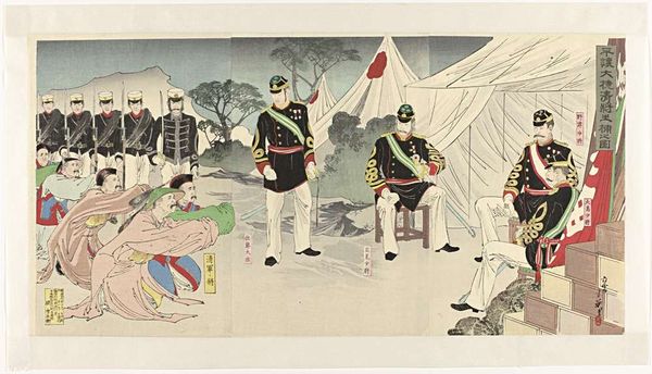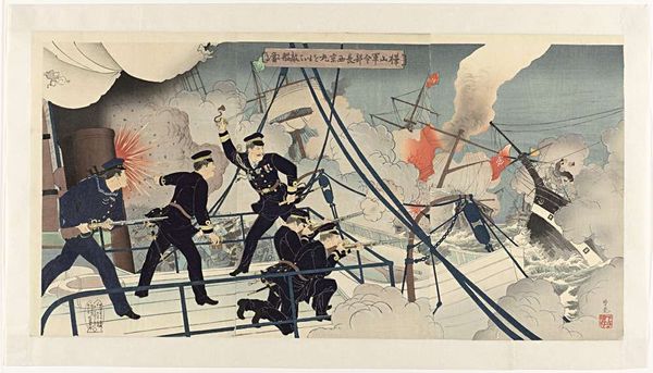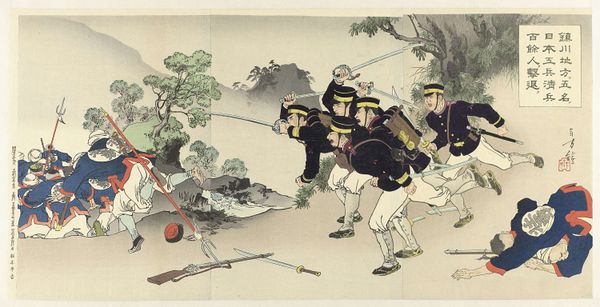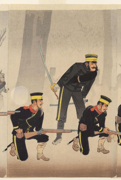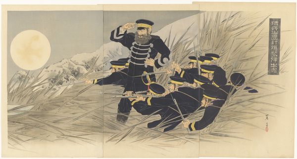 Curator: This triptych, "Battle at Jinzhoucheng on the Road to Port Arthur" by Kobayashi Kiyochika, presents a scene of military engagement. What strikes you first about it? Editor: The starkness. The muted colors against the dark uniforms... it's quite chilling, evoking the dehumanizing aspects of war. Curator: Kiyochika was fascinated by Western printing techniques. Notice the use of perspective, not traditionally found in ukiyo-e, and the way light and shadow model the forms. It's all about the processes of modernity. Editor: And the implications of that modernity! This work romanticizes the First Sino-Japanese War, reflecting the imperial ambitions of the Meiji era. We have to ask, who is this narrative serving? Curator: Absolutely. Kiyochika's role as a visual chronicler meant catering to a specific audience and their desires. The print's accessibility also meant a wider consumption of militaristic propaganda. Editor: Right. So, we see it's a commodity and a political tool. Curator: Precisely. It makes you think about the function of art itself. Editor: Indeed. A potent blend of aesthetics and power.