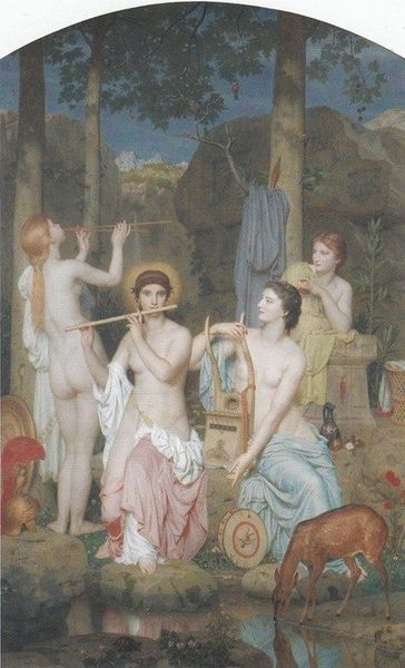Editor: This is "Truth," painted by Luc-Olivier Merson in 1901. It's an oil painting that feels both classic and romantic. What strikes me most is how the figures, especially the central one, command your attention against this idyllic, almost dreamlike, landscape. What do you see in this piece? Art Historian: Merson's "Truth" is fascinating. Beyond its aesthetic appeal, consider the era in which it was created. Early 20th-century France was grappling with massive social and political changes, deeply affected by the fallout from events like the Dreyfus Affair and the rise of anxieties concerning national identity and societal values. Editor: So, you think it reflects these tensions? Art Historian: Absolutely. Look at the central allegorical figure of Truth, she seems almost defiant. In an era marked by misinformation, propaganda, and prejudice, Truth appears almost as a rallying cry. Editor: But there is also something mythological to it? Art Historian: Definitely. Merson appropriates classical aesthetics, yes, but he imbues it with a turn-of-the-century sensibility, in my view responding to challenges surrounding secularism and reason. In his eyes, perhaps the role of art and the artist is to pursue enlightenment through this particular lens of what can be ‘seen’. This period was marked by increased debate concerning the public's consumption of images and media; how would this painting challenge viewers during the Belle Epoque? Editor: It’s like Merson is arguing for a renewed commitment to these values but against this social background that’s a new interpretation of Truth. It also has such a painterly style for this subject matter! Art Historian: Exactly! And reflecting on today's media landscape and contemporary events, these are important topics. How can these past works offer insights into our modern perspectives, even if the styles, media, or format is different? Editor: That’s a very valid point. Thank you so much. I never would have seen all this context without you shedding light on these connections. Art Historian: It’s all about questioning, really! Keep engaging and challenging traditional readings of art through the lens of history and contemporary issues, and that will change your view of these figures over time.