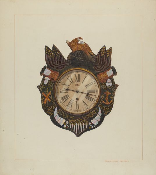 Curator: This graphite and paper drawing from around 1940 by Paul Poffinbarger presents an ornate pocket watch. The name "O.D. Castle Bros." is emblazoned where you might expect a brand name to be. What's your first take? Editor: Heavy. Seriously, it looks incredibly heavy, even for an old watch. There's something about the thick graphite strokes giving it a solid, almost burdensome feel. A weighty representation of time, perhaps? Curator: Perhaps! Poffinbarger was quite the craftsman. I see this piece as a commentary on industrial time and its control of labour. In a pre-digital age, clocks held sway over the rhythms of the work day. What happens when time itself becomes a commodity? Editor: Absolutely! The "O.D. Castle Bros." are undoubtedly clockmakers or jewelers and, from what I can see, male dominated. This artwork prompts me to think about the intersections of labor, patriarchy, and our understanding of time's relentless march, something especially relevant considering how historically disenfranchised communities often experienced temporal disruption via enslavement and colonialism. The broken promises of punctuality. Curator: Indeed. But then I also think, time moves in a strange loop here. Poffinbarger creates this meticulously detailed drawing, preserving a moment, while also reminding us of the inevitable passage of time that the watch represents. There is real care here. Almost love. Editor: A valid perspective. What kind of emotional labour goes into the mechanical reproduction of time, into these industrial clocks and into these nostalgic artworks that reproduce the clocks that ordered lives? A tension emerges here, as this drawing straddles time periods, both reflecting and reinterpreting history. Curator: So it's not simply a charming antique object, it’s an artifact laden with socio-economic significance. Thanks, you have wound up the discussion very nicely! Editor: Anytime! Perhaps together, we can make an impact and remind all of us that looking backward can help us look forward!