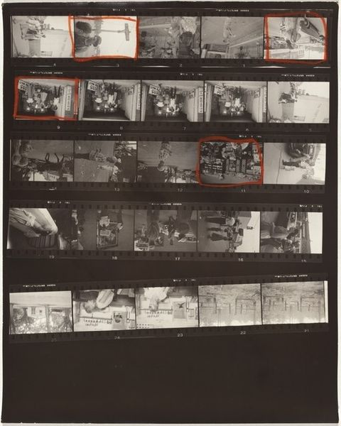 Curator: Looking at this contact sheet, a gelatin silver print entitled "New York City no number," dating from around 1954, by Robert Frank, what jumps out at you? Editor: It's evocative... a raw, almost voyeuristic glimpse into mid-century urban life, wouldn’t you agree? Curator: Absolutely, Robert Frank's work from this period serves as a potent social commentary, challenging the idealized images of America propagated in the media. This contact sheet especially offers an intriguing, granular view into Frank’s process. Editor: Right, and immediately what strikes me is the contrast. Happiness juxtaposed with the banal. I wonder if it’s intentionally showing this divide as some sort of symbol. Is it social commentary, or is he just photographing what he sees? Curator: I would say it is both. His outsider perspective, heightened by his status as a Swiss immigrant, allowed him to capture scenes that revealed a sense of alienation and unease simmering beneath the surface of post-war prosperity. We should also address the history and significance of contact sheets. Editor: Definitely. They are never really considered “final art” until now, that is! Traditionally, a means to an end for photographers. Seeing it like this humanizes and renders less precious a photograph—reminding us there were dozens of options and permutations on the way to that “final” image we now see on its own. What statement is Frank making? Curator: Frank captured reality without romanticizing it; many considered this a direct assault to the glorified American Dream—unfiltered scenes from everyday life, including some pictures depicting societal inequalities. These were previously considered taboo. Editor: He’s capturing fleeting moments… building layers, like stanzas in a visual poem. It definitely transcends straightforward realism. You can sense that tension— the symbol is the entire photograph. Curator: The seemingly random sequencing speaks volumes. Ultimately this reinforces his intent to dismantle traditional narratives, presenting a fragmented, almost stream-of-consciousness depiction of the urban landscape. Editor: Indeed. Looking closely has given me an all new understanding and appreciation of both his creative process and perspective. Curator: It highlights photography’s complicated relationship with social responsibility, power, and its crucial role in constructing and deconstructing identities.