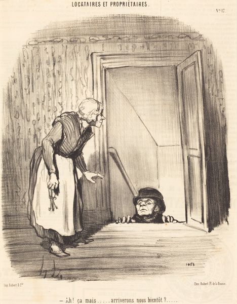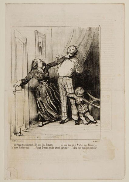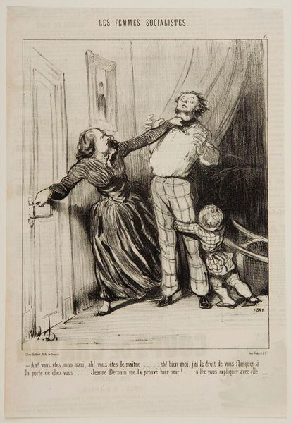 This lithograph by Honoré Daumier, titled "Ah! vous êtes mon mari, ah! vous êtes le maître…," offers a satirical commentary on gender roles and social upheaval in 19th-century France. Daumier was a fierce critic of bourgeois society, and this work encapsulates his perspective on the era’s changing dynamics between men and women. In this domestic scene, a woman is depicted physically confronting her husband, while a child clings to the man's leg. The lithograph challenges conventional representations of women as passive and subservient. Instead, Daumier presents a woman who is assertive and rebellious against patriarchal authority. The text translates to, "Ah! You are my husband, ah! You are the master... Well, I have the right to throw you out the door." The reference to Jeanne Deroin, a prominent feminist and socialist figure, further contextualizes the work within the era's feminist movements. Daumier captures the emotional intensity of the moment, inviting viewers to reflect on the power dynamics within marriage. He does so with an emotional charge that reflects the societal debates on women's rights and socialism.