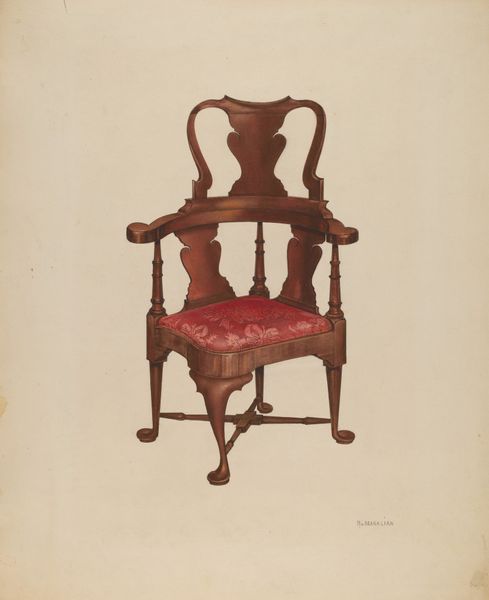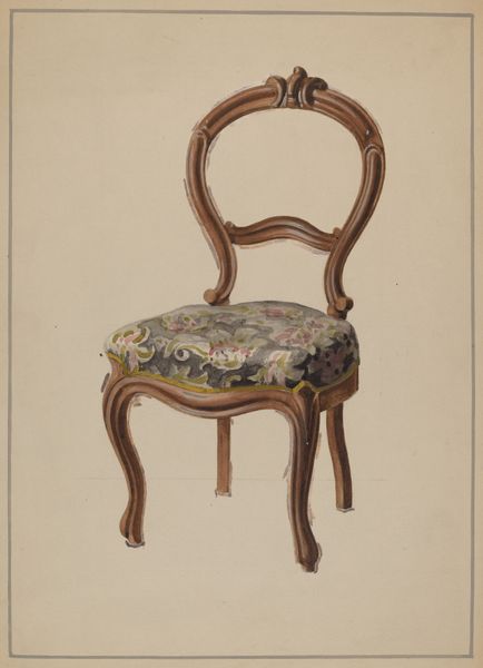 Editor: So, this is "Armchair" by Edna C. Rex, created around 1937, rendered in watercolor. There's a stillness to it, almost like the chair is waiting for someone. What do you see in this piece that jumps out at you? Curator: The solitude is certainly palpable, isn't it? For me, it's the implied absence – a human form shaped by negative space, waiting for life, conversation, maybe a good book and a cup of tea. I find myself wondering, why a chair? Why this particular style? Was it a memory, a longing, a commentary on domesticity, or just… a pretty chair? Editor: I hadn’t thought about the emptiness like that! The ornate details seem almost frozen, rather than inviting. Could it be a modernist take on traditional portraiture? Curator: Absolutely! Think of modernism’s push against ornamentation. Is Rex presenting this chair – usually a symbol of comfort and status – as an object divorced from function, almost critiquing it? Look at the slightly faded, almost ghostly floral patterns within the upholstery. Editor: I see that now – a subtle critique perhaps! I guess I saw a chair, but now I see… layers of meaning about absence and maybe even a bit of class commentary? Curator: Precisely! It's a gentle nudge to consider the stories objects whisper if we lend them an ear. Editor: I’ll definitely be looking at everyday objects differently from now on! Thanks for pointing that out.