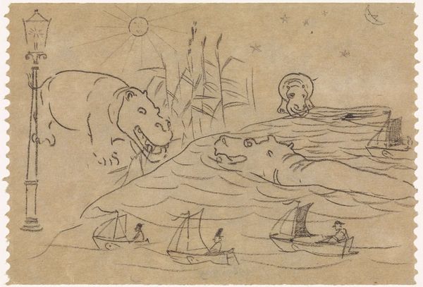 Gerrit Willem Dijsselhof sketched 'Red Foxes at a Waterside' with pencil on paper. The composition feels playful and experimental, a glimpse into Dijsselhof's working process. Look closely, and you'll notice the paper itself, a warm, creamy tone, which gives the simple sketch a soft, intimate feel. The pencil lines are delicate, almost tentative, as if Dijsselhof is feeling his way around the subject. There's a beautiful sense of layering, especially in the depiction of the foxes, where lines overlap and intersect to create a sense of depth and movement. See how the artist captures their alertness. The whole piece reminds me a little of Henri Rousseau, that same directness and charm. It’s this kind of honest, unpretentious mark-making that really gets me going, a reminder that art doesn't always have to be slick or polished to be powerful.