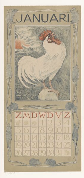 This calendar page for January 1910, by Theo van Hoytema, is made with lithographic ink on paper. The marks look like they were made with crayons or lithographic pencils. You know, that kind of waxy, crumbly texture. I love the way the peacock's plumage kind of explodes across the page. It's not just decorative; it feels like a force, like nature taking over. I think of Art Nouveau as a sort of dance between organic and geometric shapes. It's like the artist is trying to find a balance between control and letting go, and I think that’s what art is really about. There's this little chicken on the right, almost hidden in the shadow of the peacock. It's a tiny detail, but it adds so much depth to the piece. You can see echoes of Japanese prints in the composition. Maybe think of Hokusai, but with feathers!