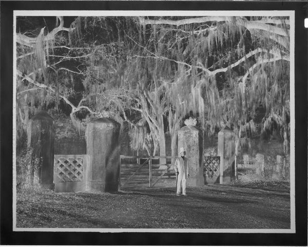 Editor: So, this is an untitled photograph by Lucian and Mary Brown, showing a backyard pool decked out for a luau. The inverted tones give it a dreamlike, almost eerie feel. What strikes you most about this image? Curator: The seeming contradiction. A luau, typically associated with vibrant colors and warmth, is presented in stark monochrome. I wonder if that was deliberate, a way to look critically at mid-century American ideas of paradise? What do you think? Editor: That's interesting. I hadn't considered the potential critique. It could be that this photographic style prompts us to question our perceptions. Curator: Exactly! It becomes less about the luau itself and more about how we imagine and maybe idealize these cultural moments. Food for thought, isn't it?
