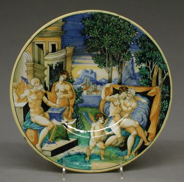 Editor: This stunning ceramic dish, made by Fra Xanto Avelli da Rovigo in the mid-16th century, immediately grabs my attention. The figures seem to be plucked from some classical scene. There’s a mix of tension and almost festive colors here. What story do you think this piece is trying to tell us? Curator: This dish reflects the elite cultural appetite of its time. Italian Renaissance artists frequently drew inspiration from classical mythology and history, seen here through these figures and landscape, bringing the erudite ideals of classical civilization into everyday life via objects such as this. It signifies far more than mere tableware. Editor: So it was meant to show off status and learning? How would it be received by a wide range of audiences? Curator: Precisely. These dishes, displayed or used during elaborate meals, acted as conversation starters, demonstrating the owner's refined taste and familiarity with classical lore, thus constructing and solidifying social standing. This idealized scene promotes values rooted in the intellectual and political life of the aristocracy, reinforcing a very particular worldview, and naturally marginalizing others. Notice also how it echoes trends in monumental painting, effectively "democratizing" grand historical themes. It speaks to the way even everyday items play into complex systems of power and influence. What do you think about the way this object is now viewed by a museum audience, detached from the cultural context of commissioning and consumption? Editor: It is fascinating to realize its modern impact and place as art supersedes the originally intended one. Thinking of it as a means for reinforcing existing power structures provides a stark context and provides plenty to contemplate. Curator: Exactly! Examining this dish helps us understand not just Renaissance art but also the social and political roles art plays within its historical context. It really helps one to examine the very fabric of our society.