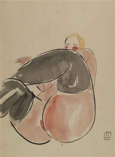 Curator: Let's spend a moment with "Observed in a Dream," a watercolor and drawing made by Egon Schiele in 1911. Schiele, an Austrian Expressionist, often explored themes of sexuality and the human body, pushing boundaries of artistic and social norms in early 20th century Vienna. Editor: Oh, this is quite something. I immediately get a sense of vulnerability, but also a defiance in the subject's gaze, even though her eyes are closed. The colors are so muted, almost ghostly. Curator: Indeed. The piece resonates with a challenge to traditional depictions of the female nude. In her almost defiant vulnerability, this positioning demands attention not just to her physicality, but perhaps more significantly to the experience of self within that body. One has to consider the power dynamics Schiele is playing with, presenting a woman not as an object to be passively viewed, but an entity with a certain inner strength. Editor: Exactly, that’s it! I can almost feel the tension. It’s almost like I am intruding upon a private moment, not just observing a posed model. The sparseness of the medium--the bare watercolor--adds to that sense of rawness, of something unfinished, like a captured thought rather than a polished presentation. There’s beauty here but there is a haunting quality as well. Curator: That aligns with his place among the Expressionists, the turn towards conveying powerful, subjective emotion through art, even when--perhaps especially when--it confronts us with the discomfiting realities of human existence, the body and sexuality, stripped of romantic idealism. Editor: It's intense, definitely a statement piece! Art with a punch to the gut is usually memorable. Makes you feel, you know? Not just think. Curator: A powerful statement indeed, offering us a challenging and significant lens to consider sexuality and identity within early 20th-century art and its social and political context. Editor: Exactly, it lingers with you.