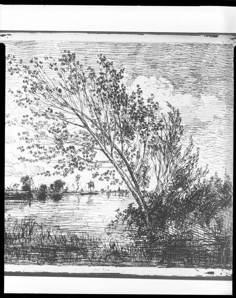 Editor: This is John Mackie Falconer's "Lake Scene with Trees," a drawing in ink and pencil from 1854, part of something called the "Cropsey Album". It’s got a pretty somber feeling, I think – those dark, tangled lines create such a contrast. What do you see in this piece? Curator: The image teems with the Romantic era's embrace of the sublime, doesn't it? Notice the prominence of the trees. Not just any trees, but ones burdened with character – gnarled branches, bare limbs, reflections in the water, acting as metaphors for mortality, for the passage of time. The birds soaring overhead—messengers between earth and sky—beckon a yearning for spiritual transcendence. Does the density of the inkwork, the heavy lines, not also evoke the weight of human experience? Editor: I hadn’t thought about it like that, about mortality. I mostly noticed the dramatic lines. It almost looks like it was quickly sketched. Curator: Indeed, the sketch-like quality is deceiving. That rapid notation is less about speed and more about conveying an immediacy of feeling, mirroring nature's volatile moods. Consider how the artist uses the symbol of the lake. It is reflective of human contemplation, where we see not only a material reflection of our visible selves but also of our emotional depths. Isn't it compelling how such seemingly simple symbols can harbor profound meaning? Editor: That’s a lot to unpack from what I saw as basically a sketch of some trees by a lake! I never would have gone so deep. Curator: Art invites us to traverse its pathways of layered meanings, prompting an interplay of historical context, the artist’s intentions, and our own subjective experiences, doesn't it? Editor: I think I'll carry those symbols with me as I interpret other works I see now.