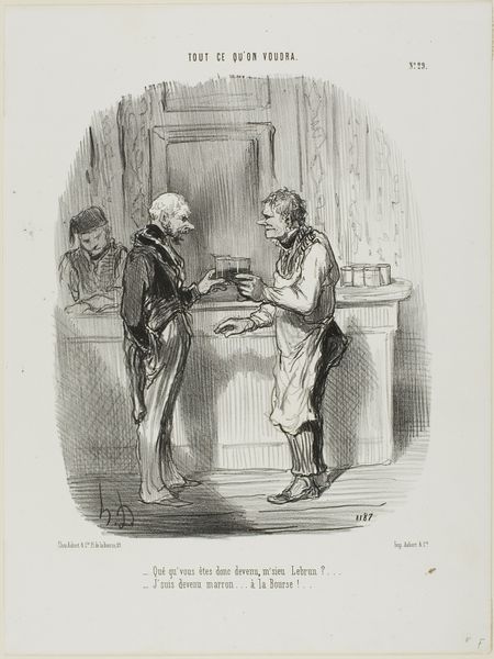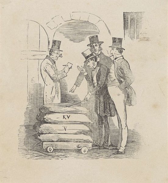 Curator: This lithograph, dating back to 1862, is entitled "Spotprent op de nieuwe Amerikaanse oorlogsschepen," which translates to "Cartoon on the New American Warships." Editor: It immediately strikes me as unsettling. The caricatured figures, the grim expressions… the atmosphere seems incredibly tense, wouldn't you agree? Curator: Precisely. Let’s focus on the compositional elements first. Notice the central placement of the stall vendor offering the toy warships. His gaze seems fixed, almost menacing, as he presents these instruments of war. There's a clear spatial arrangement designed to guide our eyes, setting him as the main fulcrum of this interaction. Editor: It’s a loaded offering, wouldn’t you say? Considering the backdrop, which is strewn with stars seemingly alluding to the American flag, and what appears to be an enslaved child on the left paired with a sign reading, “Katoen Fab,” this piece becomes overtly symbolic of the economic and human costs of the Civil War. It depicts an apparent critique on Northern profiteering by focusing on sales of Cotton and weaponization of the South by trading. Curator: Absolutely. The formal lines, so stark and almost brutal, underscore the severity of the situation. This lithograph presents such a distinct contrast in textures and tonalities within the shading. It draws us in to reflect. Editor: And those toy ships themselves! "Monitor" and "Merrimac" are printed on the sides; they seem to represent how detached individuals in power are during war because they can look at the same scene with an alternative perspective based on their social or economic class. A dark, cynical view that conflicts may benefit someone's individual gain despite social inequality. Curator: Yes. This print serves as a powerful case study. The stark lines forming this critique act as potent vehicles for delivering sharp societal observations, demonstrating the impact of the artist's deliberate approach. Editor: Well, by examining its symbolic depth and starkness, it evokes much. You understand how visual language, symbols, and satire, are intricately interwoven, carrying cultural memory across time. This artwork seems less about aesthetics and more about a critical reflection, reminding us of past events through art and a sense of self. Curator: Agreed. Its lasting message clearly highlights how potent artistry is as a critical tool, even in periods of immense tension.