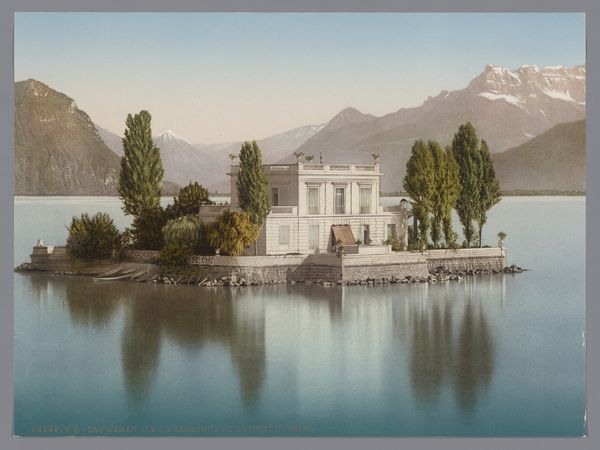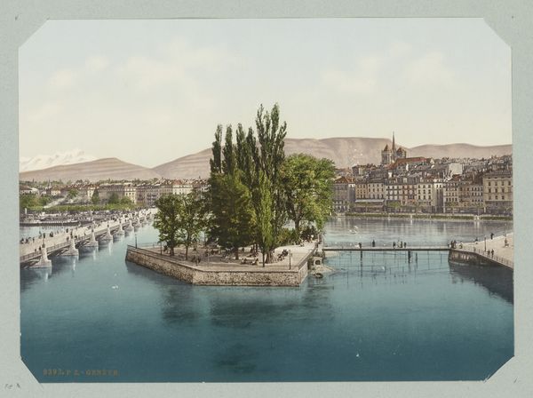 Curator: What a serene vista! The gentle reflections of the buildings shimmering on the lake create an almost dreamlike quality. Editor: Indeed. What we have here is "Gezicht op Luzern," or "View of Lucerne," dating from 1896-1897, a photochrom print created by Photochrom Zürich. This process essentially colorizes black-and-white photographs, a popular method in the late 19th century for creating postcards and souvenirs. It's currently held here at the Rijksmuseum. Curator: Photochrom, you say? It's funny, looking at it now, you get the same feeling as a really lovely watercolour. It almost tricks you, doesn't it? The calm water, the mountains... It’s peak picturesque! Did people even believe places were really *that* perfect back then, or were they in on the game, too? Editor: That’s an interesting question. The photochrom process, while seemingly straightforward, involved careful hand-coloring, allowing for a degree of idealization. The rise of tourism and the marketing of picturesque views went hand in hand. So, while reality surely inspired it, this print also fed into and shaped perceptions of Luzern as an idyllic destination. The visual vocabulary of impressionism was also deeply intertwined with late 19th-century ideas of the natural and picturesque. Curator: So it's like a visual remix, right? Part reality, part dream. It’s incredibly calming. It's almost too neat though, like someone arranged a stage set of architecture, landscape, light, everything. Which, I suppose, someone sort of did! Editor: Precisely! This photo speaks volumes about the commodification of beauty, capturing a yearning for idealized landscapes and architectural harmony. We can see it as a document reflecting societal aspirations and marketing strategies during the dawn of mass tourism. Curator: Fascinating! It’s hard to believe that something so… simple to look at holds so much complexity. Editor: I think it’s precisely that deceptive simplicity that makes it so compelling.