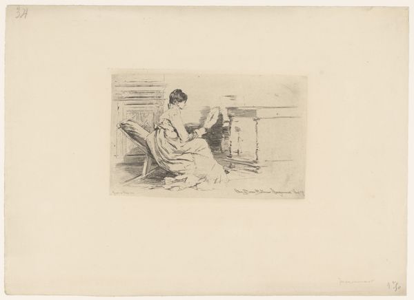 Curator: Looking at Peter Ilsted’s etching “Meisje aan een halfronde tafel,” or “Girl at a Semicircular Table” from 1909, I'm struck by its introspective mood. Editor: Yes, the subdued palette and the subject facing away immediately convey a sense of solitude. There’s something deeply quiet about the tonal gradations, and how the light catches the back of her neck. It almost vibrates with emotion. Curator: Ilsted belonged to a circle of Danish artists focused on intimate scenes of daily life. We can consider this piece, particularly through a feminist lens, as depicting a woman enclosed within the domestic sphere, possibly representing both comfort and confinement. How do we interpret her activity at the table? Editor: Formally, I notice how the artist has structured the composition. The lines are almost severe, yet softened by the tonal gradations within the print. There is such deliberate order – the shape of her body mirroring the shape of the chair – everything in support of a kind of geometric stillness. Curator: Indeed. But let's consider this geometrically still space as a site of possible labor. Perhaps the table represents intellectual work, or the management of the household itself. There's a portrait hanging on the wall as well, which reminds us how women in portraits have been visually objectified for centuries. So there are multiple layers operating within this outwardly calm and collected domesticity. Editor: I concede, that small detail of the wall hanging really does pull you out, adding complexity to an otherwise familiar theme. Considering all the factors, Ilsted has crafted an almost iconic representation of stillness. A deceptively simple, incredibly moving composition, especially when viewed from an understanding of its historical context. Curator: Absolutely, Ilsted encapsulates a particular tension – that quiet, in-between moment resonant of potential but constrained. Editor: Yes. And the enduring relevance and skillful rendering of this tension certainly confirms Ilsted's brilliance as an artist.