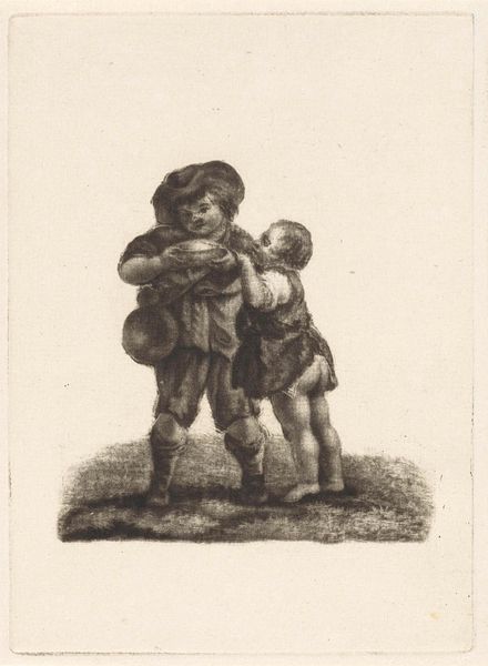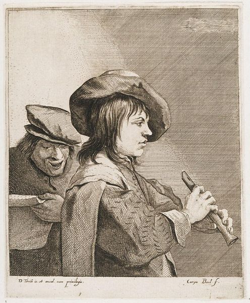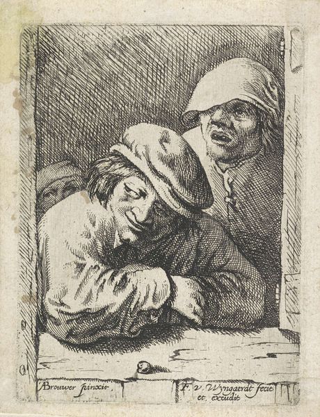 Curator: This is Frans van der Steen's "Two Men, One Smoking," a small etching held at the Harvard Art Museums. Editor: Immediately, the composition strikes me; the closeness of these figures creates this wonderfully intimate, albeit slightly unsettling, mood. Curator: Indeed. It reflects a time when the depiction of lower social strata became more common, though often filtered through a critical, classist lens. The smoking itself becomes a symbolic act. Editor: Right, there's a certain theatricality to their grimy faces. They almost seem to be in on some sort of joke, maybe at the viewer's expense? Their clothing is very evocative, too. Curator: Absolutely. The rough garments and unkempt appearance speak volumes about social hierarchies and the artist's perspective on the working class. How does their marginalization play out in your perspective? Editor: I feel a sense of shared humanity in their imperfections, a camaraderie in the shared act of smoking. But I understand your point about the possible classist undertones. Curator: This piece reminds us to critically examine the stories we tell and the power dynamics inherent in representation. Editor: I'm left contemplating the duality of its appeal—the grittiness and also the strangely endearing portrait of companionship that van der Steen has sketched.