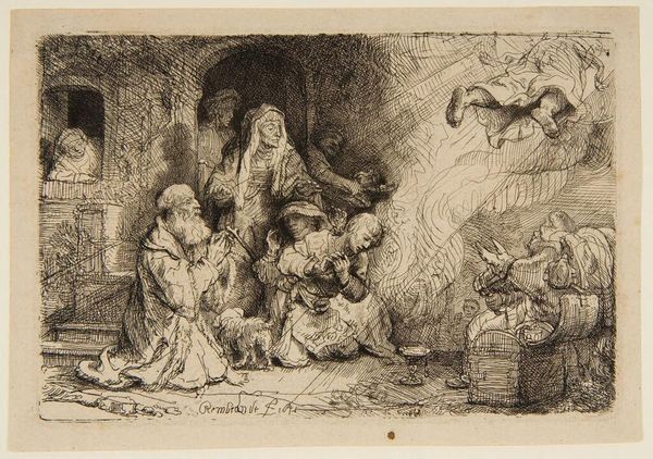 With Tobias safely home, the debt retrieved, and Tobit's eyesight restored, Raphael's mission is complete. He finally reveals his identity as he departs in a freely sketched flurry of clouds and drapery. Endowed with spiritual perception, only Tobit—and his wife, Anna—witness his departure, which so startles Anna that she drops her cane. In the Bible, just father and son are present at the leave-taking, but Rembrandt assembled the entire household, displaying his fondness for down-to-earth domesticity. Also taking leave is Tobias's dog, said to be the only dog given a specific role in the Bible.
