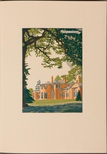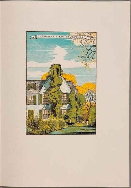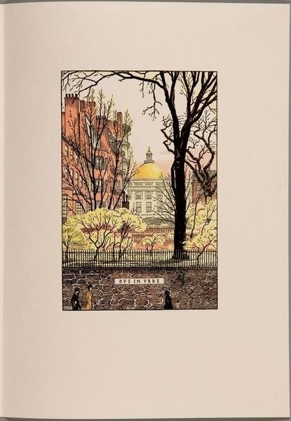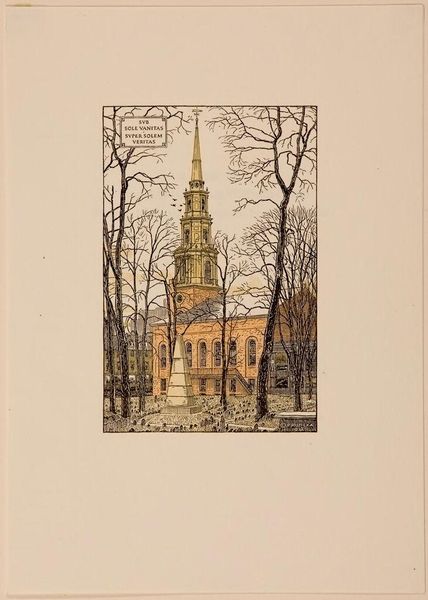 Curator: Here we have Rudolph Ruzicka's "First Church, Lancaster," a captivating print. What strikes you first about it? Editor: Its stillness. Almost a dreamlike quality, you know? The building feels grand, but softened, like a memory. Curator: Ruzicka was deeply invested in the craft. The process of engraving on wood, the layering of ink, and the choice of paper—all were meticulously considered. He aimed to connect with the traditions of printmaking. Editor: I love how the bare branches frame the scene. The Latin inscription above adds to the church's sense of timelessness. It’s as if the artist is saying that this place is loved and cherished. Curator: Indeed, Ruzicka skillfully combines old-world craftsmanship with a modern sensibility. Editor: Well, I find its quiet beauty quite inspiring. Curator: I agree. It makes you consider the processes and meanings we ascribe to sacred spaces.