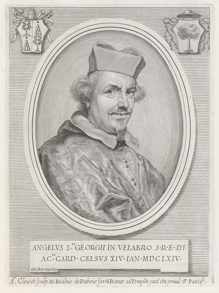 Albertus Clouwet's portrait of Cardinal Girolamo Casanate, made in 1673, presents us with a man of the church framed by symbols of power. Note the Cardinal's hat, a potent marker of status and authority within the Catholic hierarchy, set against the heraldic emblems in the upper corners. The hat, derived from the ancient Roman "pileus," a symbol of freedom, paradoxically became a sign of ecclesiastical rank, binding the wearer to the Church's structure. Consider how headwear, across cultures, signifies identity and allegiance. The heraldic emblems speak to lineage and power. These familial crests are not mere decoration; they are declarations of identity, linking the individual to a history and legacy. Such symbols recur throughout art history, from medieval tapestries to modern corporate logos, each a visual shorthand for complex narratives of power and belonging. Observe how the portrait, like a recurring dream, brings forth these ancient longings for status. The image compels us to reflect on how symbols evolve, carrying echoes of the past into our present consciousness.