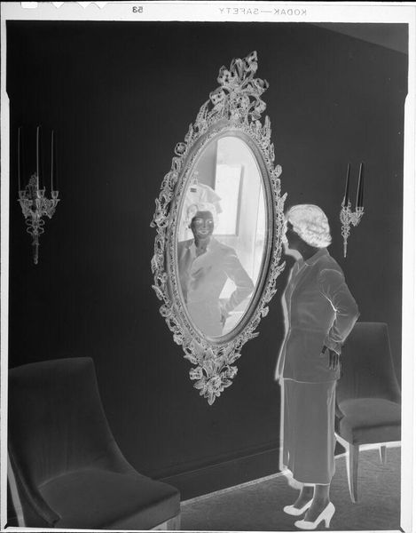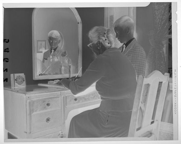 Curator: This photograph, simply titled "Untitled (woman and baby looking into mirror, seated)," is credited to Lucian and Mary Brown. The mother and child are captivated by their reflections. Editor: It’s arresting—a dark, ghostly image. The high contrast emphasizes the artifice of the scene. The mirror is surrounded by what looks like a vanity, so we see a reflection within a reflection. Curator: I think it evokes a sense of intimacy, as if the Brown's were invited into a private moment. Editor: Or, more precisely, staging a private moment to be seen. Note the ornate frame and the clearly labeled cosmetics on the vanity. Who is the audience here—the child, the artists, or us? Curator: Perhaps the Browns wanted to explore the performative nature of motherhood. Or simply record the changing faces of a mother and child. Editor: Perhaps, but the material reality—the film, the darkroom, the photograph as an object—reminds us that even the most intimate moments are mediated. Curator: It makes you wonder, what stories will viewers create about our own reflections, as time passes? Editor: Indeed, what stories will be told about the means through which we tell those stories.