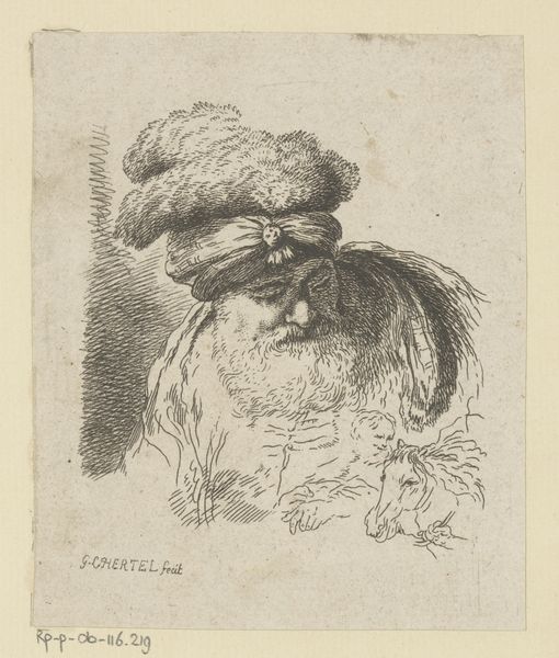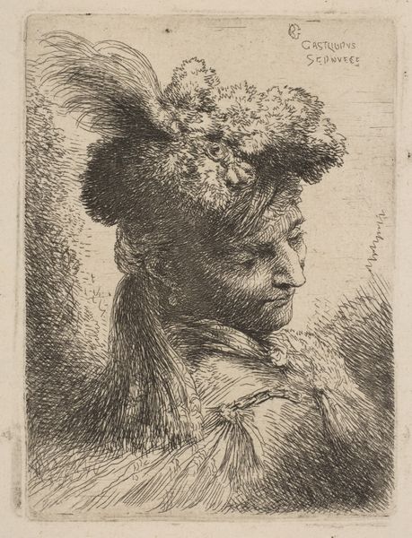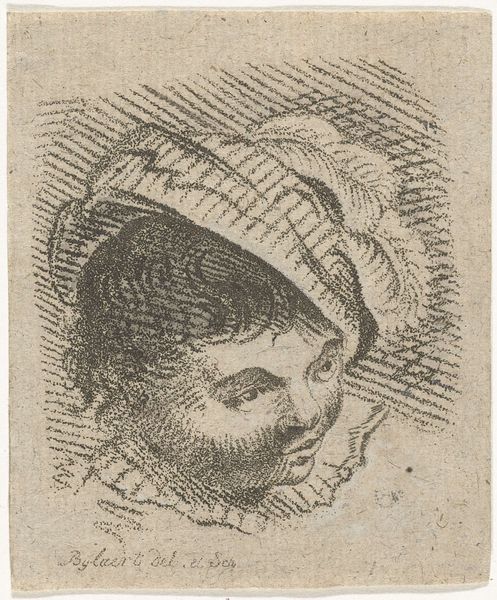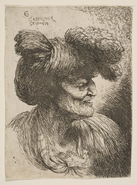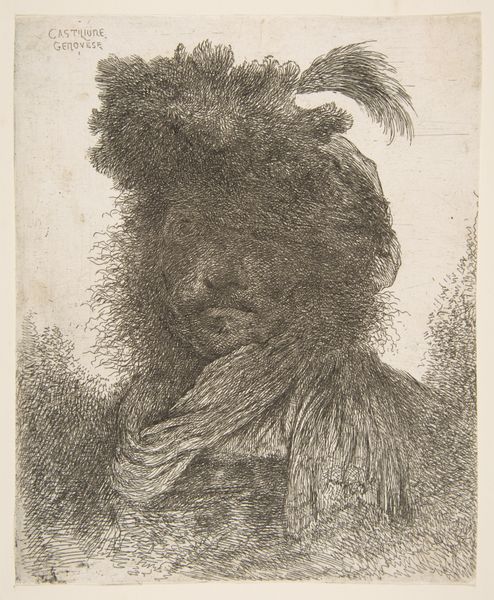 Giovanni Benedetto Castiglione created this etching, "Young man with a trumpet facing left," using metal, acid, and paper. Etching involves coating a metal plate with a waxy, protective layer, drawing an image through it, and then immersing the plate in acid. The acid bites into the exposed metal, creating lines that hold ink. Castiglione then printed the image onto paper, resulting in the artwork we see here. Look closely and you will see how the qualities of the etched line have imbued the artwork with social or cultural significance. The process allowed him to create intricate details and textures, capturing the young man's features and clothing with a remarkable sense of realism. The lines create a dynamic sense of light and shadow, adding depth and volume to the image. The image shows the cultural and aesthetic interest in ‘oriental’ dress at the time. By understanding the materials, making, and context, we gain a deeper appreciation for the artistic skill involved and a richer understanding of the artwork's historical and cultural meaning.