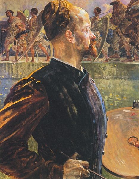 Curator: Here we see the central panel from Jacek Malczewski's triptych "The Tribute Money." In oil paint, we have a masterful exploration of realism, centering on figuration and religious themes, namely Christianity. Editor: The mood is remarkably ambiguous, isn’t it? This Christ figure seems detached, even world-weary, surrounded by faces etched with greed and suspicion. The palette is warm but a little unsettling. Curator: I am intrigued by the formal composition; Malczewski positions Christ centrally but refuses to idealize Him. There is a clear rejection of typical modes of religious art—notice how little the artist's central Christ figure conforms to symbolic visual coding. The semiotic reading here is complicated, made particularly engaging by this defiance. Editor: Precisely. The artist’s willingness to depict spiritual figures with stark realism strips away centuries of gloss. Instead, we get a Jesus who appears almost too human. The textural detail of the oil paint – see the rough strokes that form the garments - hints at an inner emotional turmoil; like a soul-searching portrait. Curator: We see the power of juxtaposition—this tension that elevates beyond the purely representational. He has chosen the specific artistic framing of Christ within the demands of society, of external expectations. Editor: The other figures leaning into his personal space—their expressions are painted to make you think and examine them closely, even fear them—like figures from a nightmare standing very close to your bed at night. Curator: Indeed. The realism works almost as a mask, paradoxically revealing the spiritual dimensions through a deep connection to earthly experience. Editor: In that respect, it’s really brave to eschew what the contemporary public demanded and bravely seek something meaningful beyond established tropes and images. This commitment elevates the whole work, if you ask me. Curator: Absolutely. In our formal reading of “The Tribute Money” this boldness remains striking and powerful even today. Editor: Well, this exploration’s definitely piqued my interest further, encouraging another look at the canvas, to delve deeper into it, layer by layer.