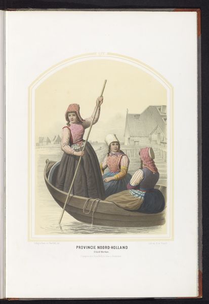 Curator: This lovely print, made around 1857, is titled "Klederdracht van Volendam in Noord-Holland," or "Traditional Clothing of Volendam in North Holland," currently held at the Rijksmuseum. Editor: It's charming. The clothing is clearly the subject, but it's also a landscape study, a scene, rendered with the softest watercolor. There's an interesting mix of formality and relaxation, capturing a posed moment that still feels rather casual. Curator: Yes, these types of prints served a critical function. The study of regional dress gained traction in the 19th century, especially among intellectuals eager to document the distinct traditions of specific communities. These images shaped ideas of national identity, celebrating diversity within a larger cultural framework. Editor: Exactly. Looking closely, the textures of the fabrics and how the garments are constructed are all rendered with so much care. The weight of the woolen fabrics and the delicate layers of the bonnets... you get a sense of not just the aesthetic, but the labor and materials required to create them. And you notice the range, even within a regional style—each figure presents a unique variation. Curator: I’m struck by how the print operates within established conventions, echoing the genre scenes favored by the Dutch Masters. The emphasis is less on capturing the unvarnished reality of rural life, and more about celebrating the charm and perceived authenticity of the peasant class. Editor: I agree that the composition may be somewhat romanticized. Yet I also appreciate the artist’s awareness of craft; consider the specific types of buttons or shawl designs. These elements speak to economic realities, local industries, and trade networks that sustained Volendam. What were the conditions and pressures of the 19th century, driving an increasing focus on documenting, archiving, even enshrining these cultural practices? Curator: A fascinating point. Perhaps a desire to preserve what was seen as disappearing folk culture, as industrialization and urbanization changed social structures across the Netherlands. The artwork is interesting in how it preserves the moment while serving a greater political purpose, one about defining and shaping national character. Editor: I come away with renewed respect for how seemingly simple artworks reveal complicated relationships between individuals, their material circumstances, and grand narratives about identity. Curator: Agreed. This modest watercolor holds so many rich layers of meaning.