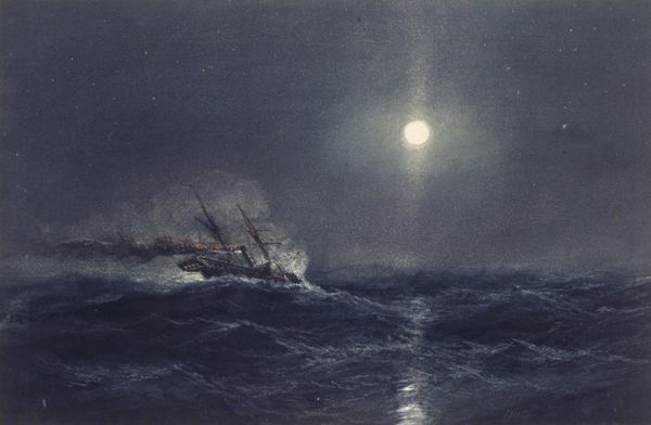 Editor: This is "Ship in a Storm" by Ivan Aivazovsky, painted in 1887. The depiction of the tempestuous sea is so evocative! What strikes me most is the dramatic contrast between the dark, ominous clouds and the illuminated, churning water. What do you see in this piece, from a curatorial point of view? Curator: The initial binary opposition you identified provides an elementary structure around which the rest of the painting comes into being. Observe how Aivazovsky's manipulation of light is not merely representational. Notice the almost blinding white crests of the waves against the deep blues and grays. This serves to amplify the sensation of disorientation. Furthermore, consider the ship itself. How does its relatively small size contribute to the overall composition? Editor: It seems dwarfed by the immensity of the storm, highlighting the vulnerability of man against nature’s raw power. The artist doesn't seem so concerned with accuracy of representation, it's more about feeling. Does this choice align with a particular art movement or philosophy? Curator: Precisely. While the ship might be viewed as secondary, ask yourself, where is its exact location in this sea of abstraction and near abstraction? It certainly embodies something of Romanticism's emphasis on sublime natural forces. The visible brushstrokes, particularly in the rendering of the waves, underscore a preoccupation with materiality, directing us away from the illusion of a perfect scene and more toward the texture itself. In many ways it almost abandons any representational intention. Editor: That’s a perspective I hadn’t fully appreciated. So, while it initially appeared as a straightforward seascape, there’s a deeper engagement with form and texture at play? Curator: Indeed. This exploration is where, through deconstruction, we can reveal further truths concerning aesthetic creation. We observe more than a seascape; rather, the dynamic tension between representation and pure form is put on display, where the materiality comes into being as a thematic gesture. Editor: Fascinating. I'll definitely look at it differently now. Curator: Indeed, a vital element, and always a useful and rewarding undertaking.