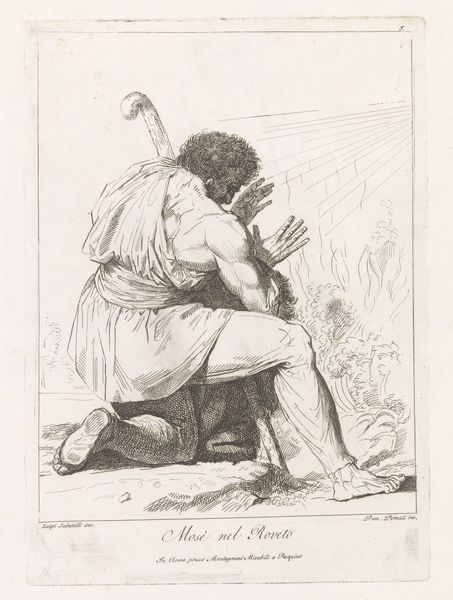 Curator: A rather arresting pen and ink drawing confronting us. I am immediately struck by the dramatic diagonals that create a dynamic tension across the scene. Editor: Indeed. This artwork is entitled "Scène uit Tasso's Gerusalemme liberata," created in 1804 by Damiano Pernati. It illustrates a scene from Torquato Tasso's epic poem, "Jerusalem Delivered." Curator: Tasso, writing about the Crusades… I see that influence clearly. Look at the figure on the left – he exudes a profound sense of patriarchal authority and ancient wisdom. Note his garb, almost Saracen in style, with the turban and flowing robes, and of course the cane suggesting age and experience. It’s a symbolic figure representing guidance, wouldn't you agree? Editor: Absolutely. He embodies the concept of divine intervention or perhaps fate itself, steering the fallen warrior, slumped on the ground, his armor cast aside. The light in the sketch emphasizes his muscular form, indicative of someone accustomed to physical exertion, yet here, defeated and contemplative. We witness him confronting inner turmoil. The older figure extends his hand and gestures forward, compelling the warrior towards action or perhaps some destined path. Curator: And the almost architectural backdrop suggests both imprisonment and protection. We are placed squarely in the midst of conflicting moral narratives, aren’t we? The Crusades, the heroic ideal collapsing. It reads, ultimately, as a narrative of internal conflict played out against a monumental, historical stage. Editor: Agreed. It's a moment of crisis represented so powerfully with just pen and ink. Pernati encapsulates the weight of history bearing down upon individual choices. Curator: Precisely, and it shows how the language of symbolism has operated across generations to create meaning within visual arts. From pose, to garb, to dramatic scenery, Pernati uses it all! Editor: What fascinates me is how the formal elements so powerfully support this narrative. The spareness of line, for example, contributing to a feeling of raw emotion. The unfinished quality lends an immediacy – it is not just a finished artwork; rather, it is an invitation into the very process of creation. Curator: A worthy reminder that visual art not only embodies a moment but also speaks directly to us across the ages, reminding us of how we shape, and are shaped by, the eternal stories of human struggle.