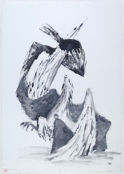 Curator: Matsutani's "Ecriture-91-7-2," created in 1991, offers an intriguing example of abstract expressionism executed in ink. Editor: My initial feeling is… restrained. Like a charcoal drawing done in the middle of a snowstorm, the stark monochrome and deliberate line work evokes a sense of quiet intensity. What stands out to you? Curator: The interplay between form and absence is fascinating. We see dense, black shapes pushing against expanses of untouched white space. It’s reminiscent of traditional ink wash painting, which balances control with chance, intention with the void. And of course the tension between material and meaning. What narratives are present? Editor: Yes, precisely! The black almost feels like molten lava cooling, becoming solidified thought. See how these inky lines stretch, hinting at a flower, maybe a wing… The material possesses weight and possibility, all simultaneously. This pushes the boundaries, it speaks a silent language that can not always be grasped right away. Curator: It could also evoke cellular structures, magnified biological forms… ink, of course, being intrinsically linked to the idea of text, language, therefore human record and knowledge. I find it compelling how such limited materials can speak volumes across cultural contexts. Editor: And that starkness almost compels intimacy. You want to move closer, examine the minute cracks in the ink, decipher that whispered language for yourself. What else can you interpret from this visual poem? Curator: Well, in many cultures, black and white represent opposing forces. Think of yin and yang. Here, these elements don't simply contrast; they exist interdependently, creating balance. Absence isn't merely empty; it defines presence. That is to say, both balance one another as complements. Editor: Very true! As this plays out I can say that I am able to observe harmony from opposite entities and their interactions. So well done! It speaks of a delicate balance, a constant becoming… This piece invites prolonged contemplation, I think. Curator: It absolutely does. The artwork reflects on that balance and invites further discussion, with an almost hidden or even coded understanding between what is seen, perceived and expressed. Editor: Indeed, thank you for this profound dive! The more that has been explored with this abstract-expressionistic art through symbolism the clearer this narrative reveals itself!
